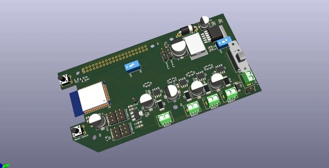 ESP32 microcontroller which handled generating the PWM signals for driving of the motors (DC brushed with a A4950E integrated H bridge) as well as connectors for I2C and SPI based magnetic encoders (also some endstops).